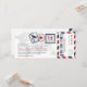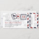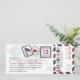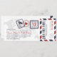 Um cartão de embarque inspirou um convite de passagem com detalhes de carimbo de passaporte e faixas de correio aéreo. Mostrada em tons de Marinho, Vermelho, Cinza Escura e Cinza Luz. O verso inclui espaço extra para qualquer informação de hotel, viagem ou site.