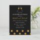 Convites de celebração de aniversário de 50 anos de casamento com confetes brilhantes dourados e pretos com tipografia de escrita manual e taças de champanhe.