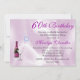 convite de aniversário fantástico feito com gráficos de fundo cor-de-rosa. Uma garrafa de champanhe e de vidro do lado esquerdo do convite, com bolhas coloridas a subir. Personalize todo o texto para atender às necessidades do seu partido. Um convite bonito para uma festa de senhoras.