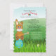 Este convite projetado graficamente é muito fofo com o coelho sentado no ovo pintado, e um gramado com colinas onduladas. O design do convite apresenta um fundo perfeito para o brunch em família e caça aos ovos de Páscoa. Personalize este convite com suas próprias palavras e tenha uma Feliz Páscoa.