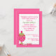 Bonito convite para um tema de chá de fraldas de buffet doce. Gráficos de um prato branco, cor-de-rosa e doce verde e doces revestidos, decoram o canto inferior esquerdo do convite cor-de-rosa e branco. O texto em rosa e verde está pronto para personalizar o evento especial.