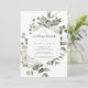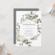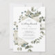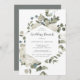 Este convite de café da manhã de casamento floral de inverno é perfeito para um café da manhã de casamento elegante. O design rústico simples apresenta flores brancas com folhas de eucalipto e folhagens de inverno, com um sentimento moderno country.