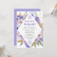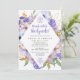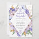 Flores roxas e azuis elegantes criam uma moldura em forma de diamante para cercar os detalhes do seu café da manhã pós-casamento.