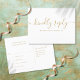 Um cartão de resposta com uma assinatura elegante em ouro e tipografia chic. O verso contém as informações do casamento e um pedido de música para os convidados. Desenhado por Thisisnotme©