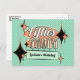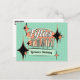 O convite de cartão-postal para festa dos anos 50 apresenta tipografia no estilo de sinalização moderno de meados do século com "Festa dos Anos 50". Este design inclui elementos de verde menta, laranja, preto e branco, fundo de bolinhas, formas retrô, estrelas e designs inspirados nos anos 50. Inclui um modelo para personalização.