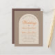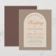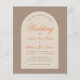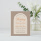 Um convite de casamento moderno com tons neutros terrosos. Tem um arco com texto dentro. A palavra Casamento e os nomes são escritos em uma caligrafia elegante laranja, o restante do texto é marrom, a primeira linha é um texto arqueado.