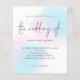 Convite De Casamento Azul Cor-De-Água Rosa. Um alternativo de 4,5 pol x 5,6 pol com preço inferior. Disponível em um STOCK DE CARTÃO SEMI-GLOSS 110 lb, que é a opção padrão (mais espesso para convites), OU um STOCK de PAPEL THINNER FINISH 80 lb FINISH (ideal para gabinetes). Os envelopes são um extra opcional e são ligeiramente maiores que o tamanho da placa. Uma tipografia de na moda set em preto para o título principal de "Casamento de complementar o resto do texto que você pode facilmente personalizar", está sobreposta a um belo fundo pastel de lavagem a aquarela de dois cantos em tons de rosa e azul.