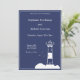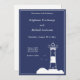 Um convite de casamento simples e elegante e azul de marinho com uma ilustração de um farol para um casamento de tema marinho e náutico!