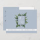 Postal de anúncio de casamento com caligrafia simples e elegante, azul empoeirado, com monograma e folhagem rústica na frente.