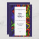 Este convite tem um fundo azul-marinho com um desenho de ankara e outros acentos de cor, uma caixa retangular branca no centro e detalhes do casamento em topografia simples azul-marinho.