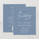 Convite de Casamento em Tom Azul Poeira Elegante Caligrafia Orçamento Tudo em Um com Detalhes no Verso... Nosso convite de casamento exclusivo e acessível "Tudo em Um" apresenta caligrafia branca combinada com texto serifado em um fundo azul poeira moderno. O verso do convite contém todos os detalhes que você normalmente veria em cartões separados no pacote de casamento, incluindo horário e local da recepção, opções de hospedagem, site do casamento, informações de RSVP e lista de presentes. Este convite de casamento de estilo moderno foi projetado para ser elegante e econômico... sem falar em economia de tempo. No verso, há também um modelo de código QR gráfico que você pode substituir pelo seu próprio código (ou excluir se não planeja usá-lo). Todo o texto de exemplo (exceto os elementos de caligrafia gráfica) pode ser facilmente revisado com suas próprias informações no modelo de personalização.
