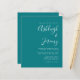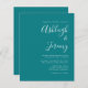 Este simples convite de casamento moderno apresenta um texto branco sobre um fundo azul-turquesa. Adicione os nomes da noiva e do noivo na caligrafia de escrita manual do na moda e os detalhes na fonte sans serif. O reverso é uma sombra de turquesa sólida.