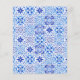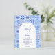 Este design rústico apresenta um padrão de fundo de azulejos portugueses, azulejos, de cor azul e branca. Personalize-o com os nomes da noiva e do noivo em um roteiro de caligrafia azul e o texto remanescente em uma combinação de sans serif, copperplate e itálico em forma de arco branco. Um padrão de azulejo correspondente aparece no lado oposto.