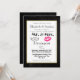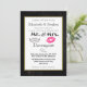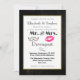 Um convite de casamento moderno com lábios rosados e uma ilustração de bigode retrô. Colocado em um fundo de quadro-negro dentro de uma moldura dourada. Personalize com todos os detalhes do seu casamento.