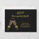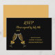 Um cartão de RSVP de casamento elegante e sofisticado com tema de taças de champanhe em preto e dourado. O texto personalizável está em letra cursiva elegante contra um fundo preto. Este cartão apresenta duas taças de champanhe espumantes num brinde ao novo casal. Um design simples e elegante para o seu dia especial. Procure os convites combinando no mesmo estilo.