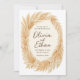 Convite de casamento boho caloroso com grama pampas, folhas de palmeira secas e tons terracota. Moldura floral circular com nomes em caligrafia e texto minimalista para um casamento inspirado no deserto.