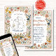 Um convite de casamento boho com uma ilustração simples e fofa de um fantasma. O design do fantasma tem um toque suave e romântico e pretende sugerir um amor duradouro, do tipo "até que a morte nos separe", sem ser demasiado sério. O visual geral é divertido, com elementos florais coloridos emoldurando o design para mantê-lo leve e caloroso.