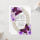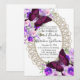 Estes convites de casamento de renda branca deslumbrantes apresentam borboletas e flores roxas e rosas creme. Perfeito para um casamento rústico no campo ou para uma celebração de casamento DIY. Muito elegante.