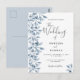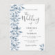 Um convite de casamento em branco e azul empoeirado. Um fundo branco chic na frente. Decorados com prigos e folhagem azuis botânicos. Escrita moderna e extensa, tipografia com o texto: O casamento de... Modelos para nomes próprios e detalhes do casamento. Texto das cinzas escuras. Fundo: fundo azul empoeirado. Dica: Se você não quiser que pareça um cartão postal, clique em personalizar, vá para o verso e remova o divisor e o carimbo de posto.