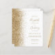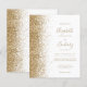 A borda esquerda deste convite de casamento moderno e elegante apresenta uma borda de brilho falso dourado. O texto personalizável combina caligrafia dourada, fontes copperplate e itálico em um fundo branco. O verso apresenta um design correspondente branco e dourado com brilho.