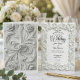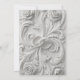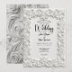 Convide seus convidados para uma celebração de elegância atemporal com um design que sussurra grandeza real e romance histórico. Perfeitamente adequado para um evento formal de gala, esta papelaria captura a beleza sofisticada da escultura clássica em um formato moderno. A paleta monocromática garante que ela complemente qualquer esquema de cores de casamento, ao mesmo tempo em que permanece distintamente luxuosa. Este design apresenta uma impressão digital de alta resolução que simula a aparência tátil de um baixo-relevo 3D ou escultura em gesso. A obra de arte é caracterizada por folhas de acanto onduladas, rosas em flor e uma moldura barroca ornamentada renderizada em tons de branco, marfim e creme com sombras cinzas suaves para criar um efeito de profundidade trompe l'oeil convincente. A tipografia é uma mistura de caligrafia preta elegante para nomes e fontes serifadas tradicionais para detalhes, definida contra o fundo falso esculpido. O verso (ou área de padrão) exibe uma continuação da densa folhagem floral com dois anéis de casamento entrelaçados no centro, mantendo a estética de pedra talhada simulada. Nota: o papel é liso e plano; a textura é apenas um efeito visual