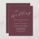 Este simples convite de casamento moderno mostra um texto branco sobre um fundo burgundy. As palavras "O Casamento" aparecem na escrita da na moda. Adicione os nomes dos casais na fonte do serif e o texto restante no sans serif. O lado inverso é sólido.