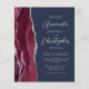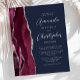 A borda esquerda deste convite de casamento moderno e elegante apresenta uma borda de ágata em vermelho burgundy com acabamento em brilho prateado falso. O texto personalizável combina fontes script e sans serif em cinza prateado sobre um fundo azul marinho. O verso apresenta um design de ágata burgundy e prata correspondente.