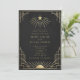 Um convite de casamento luxuoso preto e dourado com motivos celestiais radiantes e detalhes geométricos Art Déco. Personalizado com nomes, data e local, este design traz elegância atemporal e simbolismo cósmico para a sua celebração. Por favor, note: dourado é uma cor impressa, não metálica ou em folha.