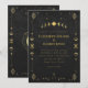 Este convite de casamento preto e dourado Celestial Gothic apresenta um design elegante inspirado na astrologia, com fases lunares luminosas, detalhes geométricos no estilo tarot e acentos refinados em ouro antigo sobre um fundo de carvão profundo.