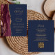 Economize no custo de impressão e envio de cartões RSVP separados com este convite de casamento econômico, moderno e elegante, tudo em um. A borda esquerda apresenta uma borda de ágata em aquarela burgundy aparada com brilho falso dourado. O texto personalizável combina escrita à mão em dourado, fontes copperplate e itálico em um fundo azul-marinho. O verso fornece espaço para detalhes do casamento em um fundo azul-marinho sólido, juntamente com um código QR que os convidados podem escanear para visitar seu site e responder. OBSERVAÇÃO: os envelopes não estão incluídos automaticamente com esses convites econômicos, então lembre-se de escolher a opção "envelopes brancos em branco"!