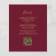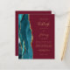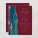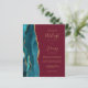 Economize no custo de impressão e envio de cartões RSVP separados com este convite de casamento econômico, moderno e elegante, tudo em um. A borda esquerda apresenta uma borda de ágata em aquarela azul-teal aparada com brilho falso dourado. O texto personalizável combina escrita à mão em cor dourada, fontes copperplate e itálico em um fundo vermelho burgundy. O verso fornece espaço para detalhes do casamento em um fundo burgundy sólido, juntamente com um código QR que os convidados podem digitalizar para visitar seu site e responder.