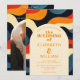 Este convite de casamento todo-em-um groovy, colorido, retrô e ondulado pode ser personalizado com suas informações em tipografia moderna e o código QR do seu site de casamento e foto no verso. Criado por Thisisnotme©