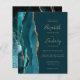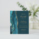 A borda esquerda deste convite de casamento moderno e elegante apresenta uma borda de ágata em azul turquesa com pintura à água e acabamento em brilho dourado falso. O texto personalizável combina caligrafia dourada, copperplate e fontes itálicas em um fundo azul turquesa escuro. O verso apresenta um design de ágata azul turquesa e dourado correspondente.