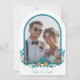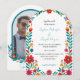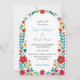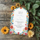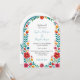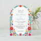 "Celebre sua herança com este vibrante convite de casamento inspirado na Talavera mexicana. Com um impressionante arco floral em tons ousados de vermelho, azul-turquesa e dourado, este design é perfeito para um casamento colorido de fiesta ou uma celebração em destino no México. A forma elegante do arco e os motivos tradicionais da arte popular criam um visual festivo e sofisticado que define o tom perfeito para o seu grande dia. O texto totalmente personalizável permite que você adicione facilmente seus próprios detalhes para um toque único e pessoal."