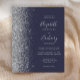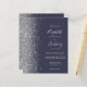 A borda esquerda deste convite de casamento moderno e elegante apresenta uma borda de brilho falso prateado. O texto personalizável combina escrita à mão em cinza prateado claro, fontes copperplate e itálico em um fundo azul escuro. O verso apresenta um design correspondente em azul escuro e prata.