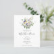 Um convite de casamento econômico e elegante com um lindo buquê de flores selvagens campestres acima dos detalhes do casamento em texto elegante. O verso tem uma cor de fundo correspondente que pode ser personalizada para a sua cor favorita. Criado por Thisisnotme©