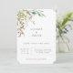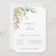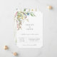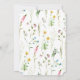 Desenho de tipografia moderno e chique, convite de casamento que apresenta um buquê botânico de flores silvestres em aquarela em tons de rosa, roxo, amarelo e azul com folhagem botânica verde fluindo. O verso do convite apresenta um padrão de design floral correspondente.