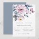 Belo arranjo floral em aquarela azul poeira e rosa, convite de casamento. Design de tipografia moderno e sofisticado em cinza e azul. O verso do cartão apresenta cor sólida mostrada em azul poeira, que pode ser personalizado.