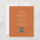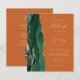 Economize no custo de impressão e envio de cartões RSVP separados com este convite de casamento econômico, moderno e elegante, tudo em um. A borda esquerda apresenta uma borda de ágata em aquarela esmeralda aparada com brilho falso dourado. O texto personalizável combina escrita à mão em dourado, fontes copperplate e itálico em um fundo laranja queimado ou ferrugem. O verso fornece espaço para detalhes do casamento, juntamente com um código QR que os convidados podem digitalizar para visitar seu site e responder.