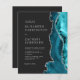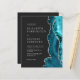 A borda direita deste convite de casamento moderno e elegante apresenta uma borda de ágata em aquarela azul-teal aparada com brilho prateado falso. O texto personalizável combina fontes serifadas cinza-prata, copperplate e itálico em um fundo preto de ardósia. O verso fornece espaço para detalhes do casamento em um fundo preto de ardósia sólido, juntamente com um código QR que os convidados podem escanear para visitar seu site e responder, o que economiza o custo de impressão e envio de cartões de resposta separados.