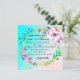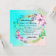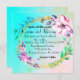 Um fundo pastel azul-teal brilhante e bege suave mostrando flores vibrantes rosa e roxo sombreado em lados opostos da coroa com alguns ramos verdes jogados para contraste. Dentro da coroa estão os detalhes do casamento em fontes elegantes. Elegante e simples