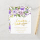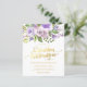 Convites de casamento baratos com um fundo branco simples, uma exibição floral em aquarela roxa, um título tipográfico em foil dourado falso elegante e um modelo de casamento moderno.