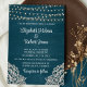 Adicione um toque de charme boêmio aos seus convites de casamento com este convite de casamento Rustic Elegance Dark Teal, rústico e caprichoso. O fundo de madeira em tom de azul escuro define o cenário para uma celebração mágica, adornada com luzes de corda que criam uma atmosfera romântica. Delicados padrões de renda floral branca enquadram os cantos do convite, adicionando um toque elegante e feminino. A combinação de uma fonte de letra manuscrita vintage e uma fonte serifada legível em branco cria um belo contraste com o fundo escuro, garantindo que todos os detalhes sejam facilmente legíveis. Este convite é perfeito para casais que buscam um tema de casamento único e encantador. Defina o tom do seu dia especial com nossos convites de casamento Rustic Elegance que deixarão uma impressão duradoura nos seus convidados.