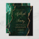 Este convite de casamento elegante apresenta uma imagem de fundo de ágata esmeralda em aquarela, aparada com brilho dourado falso. O texto personalizável combina escrita moderna dourada, copperplate e fontes itálicas. O verso apresenta um design de ágata esmeralda e dourado correspondente.