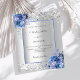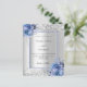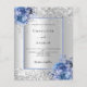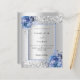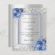 Fundo com aparência prateada falsa decorado com rosas azuis, flores e confetes. Personalize e adicione seus nomes e detalhes do casamento. Letras pretas.