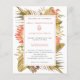 Casamento Floral com Folhagem Tropical Econômica. Uma alternativa econômica MENOR 4,5” x 5,6”. Disponível em PAPEL CARTÃO DE 110 lb SEMI-BRILHANTE, que é a opção padrão (mais grosso para convites), OU PAPEL DE 80 lb COM ACABAMENTO EM SEDA (ideal para enclosures). Envelopes são uma opção extra e são ligeiramente maiores que o tamanho do cartão. Este design colorido tem uma borda de flores e gramíneas e folhas de pampas, em torno da tipografia estilosa e simples que você pode personalizar facilmente. Um fundo cor de coral coordenado também está na parte de trás, que você pode alterar para uma cor diferente, se desejar, através da opção personalizar mais.
