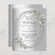 Um fundo com aparência prateada falsa. Uma moldura oval prateada decorada com folhagem verde-sage. Personalize e adicione seus nomes, detalhes. Texto preto.