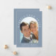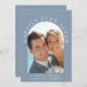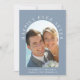 Elegante convite de casamento ou anúncio de casamento privado em azul poeirado. A frente apresenta sua foto do dia do casamento em uma moldura arqueada e "Felizes para Sempre" em tipografia branca elegante. Adicione seus primeiros nomes, data e local do casamento. No verso, personalize seu anúncio de casamento e convite para a recepção e adicione seus nomes em uma caligrafia semelhante a uma assinatura.