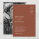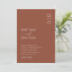 Convites de casamento minimalistas e elegantes com um fundo boho de terracota, suas iniciais no canto superior direito, um modelo de texto moderno e elegante com seus nomes e as informações do casamento.