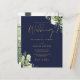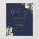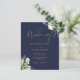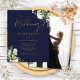 Este convite de casamento elegante e econômico com folhas de botânica pode ser personalizado com suas informações em tipografia dourada chique em um fundo azul naval e com sua foto especial no verso. Projetado por Thisisnotme©